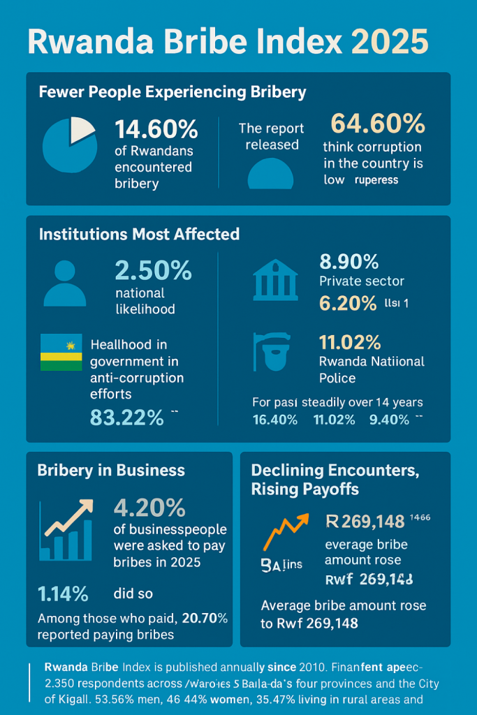 The report also highlights bribery in the judiciary and healthcare sectors. In local government offices, 39.1% of respondents reported bribery related to issuing construction permits. Police corruption related to driving licenses stands at 36.6%, while judges have been found accepting bribes ranging from 500,000 to 600,000 Rwf.