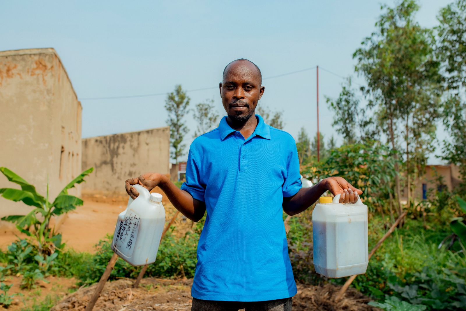 Photo: Kaberuka Gilbert, President of farmer facilitators in Murundi Sector, says training from KIIWP2 enabled farmers to produce vermicompost liquid fertilizer that repels pests, boosts yields, and improves soil health, with the group now producing 21 litres weekly.