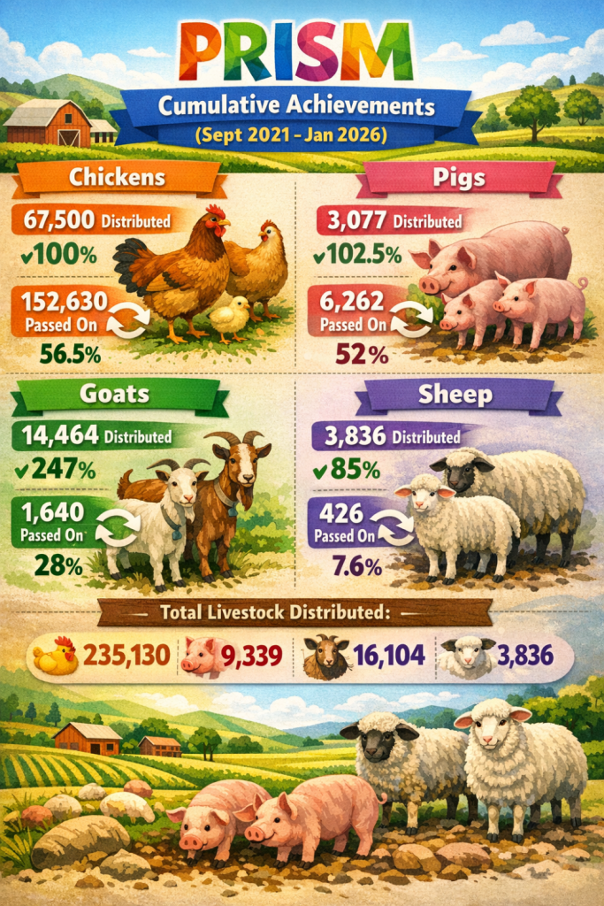 In Huye District alone, PRISM has distributed about 700 pigs, 7,000 chickens, and 1,200 goats. These numbers also include animals that beneficiaries later passed on to other community members as part of the program’s livestock-sharing system.