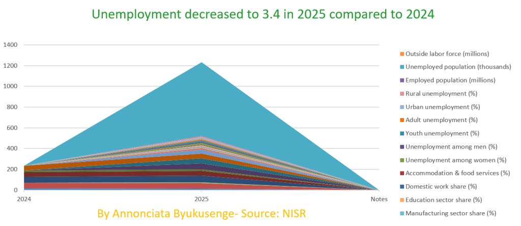 The employment situation in Rwanda shows that unemployment has decreased to 3.4%, according to a Labour Force Survey – 2025 (Q2) conducted and presented by the National Institute of Statistics of Rwanda (NISR), with 53.8% of the population having a job by May 2025, up from 52.0% at the same time in 2024.