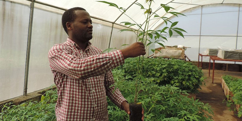 Photo:Dr. Athanase Nduwumuremyi, Senior Research Scientist and Program Coordinator of RAB’s Roots and Tubers Program, shows a healthy, disease-free cassava plant inside a screen house.