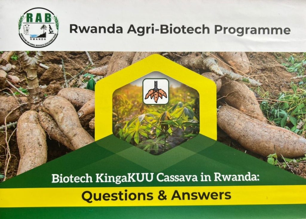 In response to these challenges, Biotech KingaKUU cassava was introduced to improve productivity and protect crops from these destructive diseases. However, questions and concerns remain among the public regarding this biotech crop. To address these issues, the Rwanda Agriculture and Animal Resources Development Board (RAB) has developed a seven-page booklet providing detailed information on Biotech KingaKUU cassava. The publication explains how the crop works and responds to various questions about it.